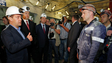 Премьер-министр России Дмитрий Медведев спустился в угольную шахту «Листвяжная», он пройдет по маршруту 1,4 километра, который ежедневно преодолевают шахтеры.