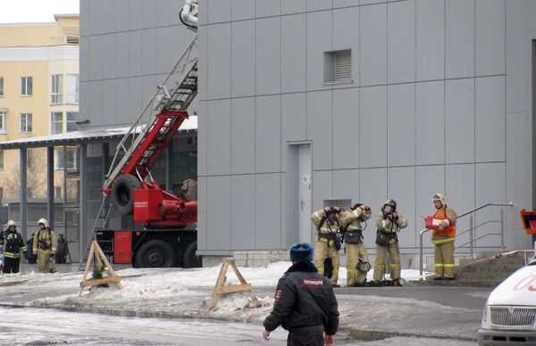 В торговом центре проводятся учения. По легенде, взорвался газовый баллон и начался пожар. Огнеборцы оттачивают свои действия на крупном объекте с массовым скоплением людей, а руководство, служба безопасности и коммерсанты учатся эвакуироваться.