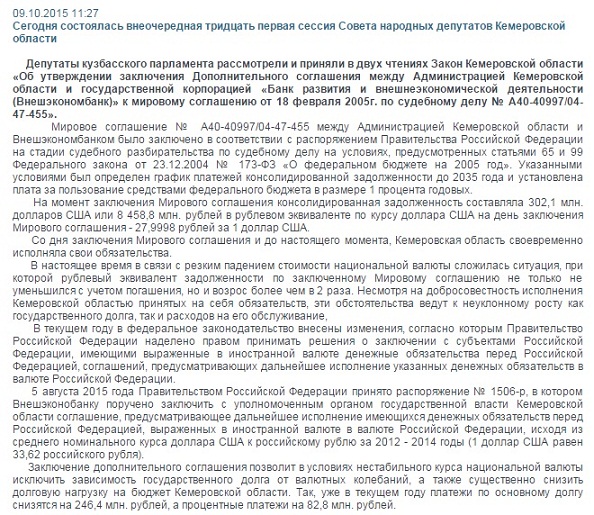 Увы, пропаганда очень подробно и доходчиво разжёвывает нам новости, когда речь идёт об очередном популистском поступке чиновников. А когда речь заходит о существенно важных финансовых вопросах – либо молчит, либо скупо публикует такие вот заумные тексты, как информация «об утверждении заключения Дополнительного соглашения между Администрацией Кемеровской области и государственной корпорацией «Банк развития и внешнеэкономической деятельности (Внешэкономбанк)» к мировому соглашению от 18 февраля 2005г. по судебному делу № А40-40997/04-47-455».