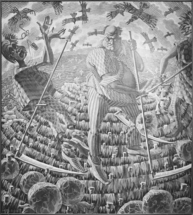 И уже окончательно добит жёсткой и бескомпромиссной  метафорой  вселенского апокалипсиса «Косари», где полоумные косари выкашивают на ужасном поле, прорастающем погребальными крестами, все подчистую, включая ноги других косарей: такой нутряной – из собственной печенки-не подсмотренный ни у какого Сальвадора Дали русский сюр, написанный в 2010 году.