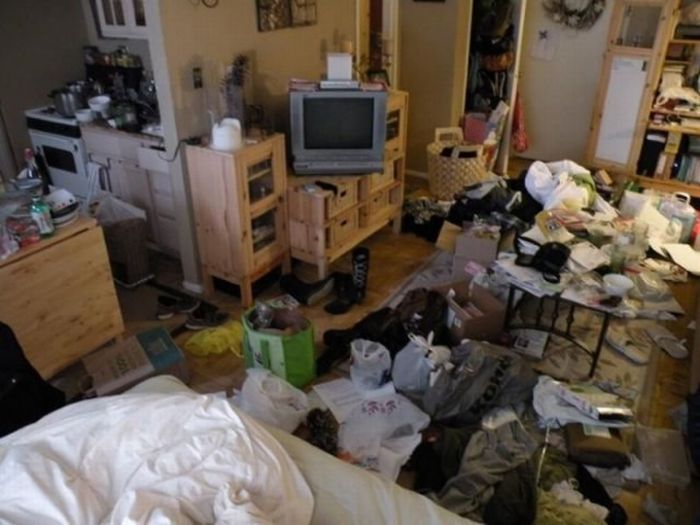 Комнаты, коридор, кухня забиты вонючей добычей настолько, от пола до потолка, что хозяйке стало не пролезть, не пройти.