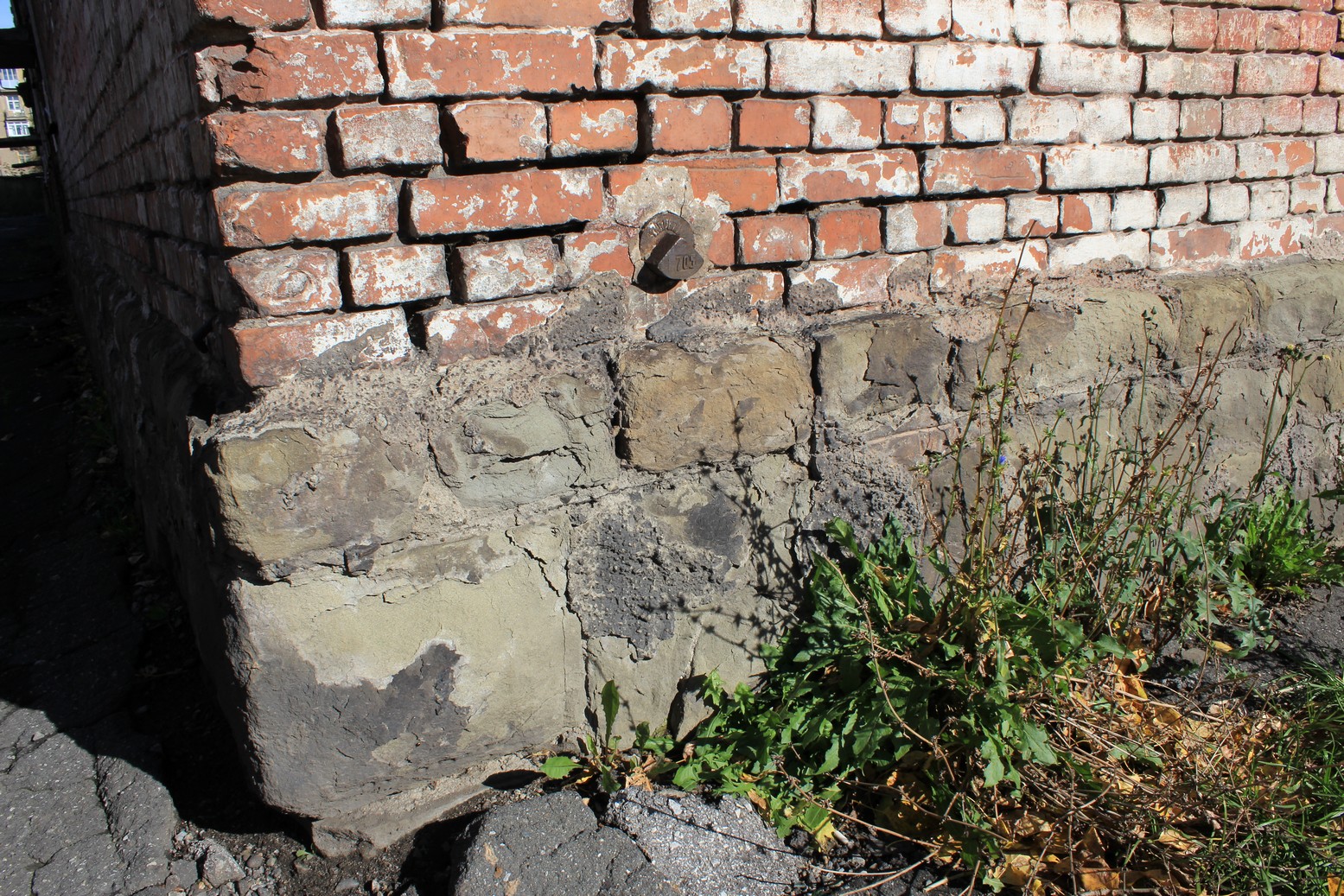 Неэффектная с виду нижняя кладка этого дома – это необработанный бутовый камень. Так строили первые капитальные здания в Новокузнецке, но по сравнению с кирпичом, который, сами видите, как крошится, такая кладка – и правда, надёжная, она на века! Её знали ещё со Средневековья – именно из бутового камня был построен знаменитый Пражский кремль и Карлов мост, по которому в победном 45-м шли советские танки из броневой стали, выплавленной в нашем городе… И хоть бы что!