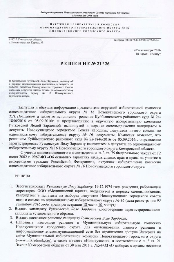 Уже когда этот номер готовился к печати, поступило сообщение о том, что кандидат в депутаты Новокузнецкого городского Совета народных депутатов по 16-му округу Лола Рутковская утром в понедельник сенсационно выиграла суд у окружной избирательной комиссии. Суд обязал ОИК-16 зарегистрировать ее как кандидата в депутаты, выдать удостоверение и прекратить чинить препоны.