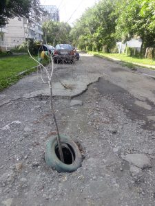 Замеченная нашими читателями яма на дороге больше не будет оставаться незамеченной пешеходами и автомобилистами. После публикации сообщения о входе в таинственный лабиринт небольшая по диаметру, но глубокая яма на проезжей части возле жилого дома ул.Белана, 3-а и детского сада №58 преобразилась. Теперь в яму воткнуто сухое дерево, а само отверстие в непонятный лабиринт заткнуто старой резиновой покрышкой. Как говорится, дешево и сердито, плюс экономия на вывозе мусора.