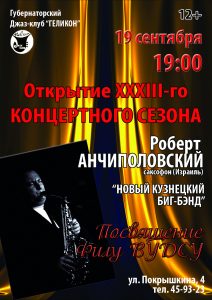 19 сентября в 19.00 в Губернаторском джаз-клубе «Геликон» состоится открытие 33 – го концертного сезона. На сцене Губернаторского джаз – клуба «Геликона» будет выступать Роберт Анчиполовский (Израиль) – саксофон, оркестр «Новый Кузнецкий биг-бенд» с программой: Посвящение Филу Вудсу.
