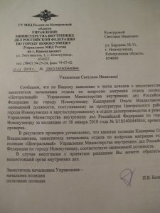 новокузнечанка приехала в отдел полиции. При получении копий протокола и постановления по делу об административном правонарушении. Светлана по своей невнимательности не поставила дату в одном из документов, и этот факт сыграл ей на руку. Уже потом, при более внимательном изучении документов, она обнаружила и ряд других ошибок и неточностей, допущенных при их составлении представителями миграционной службы. Новокузнечанка была шокирована, когда узнала, что в феврале 2017 года она якобы привлекалась к административной ответственности за аналогичное правонарушение. Однако в ОП «Левобережный» этот факт не подтвердили, заверив, что данная информация в базе данных отсутствует. Позже этот факт списали на техническую ошибку, допущенную инспектором. Светлана Кунгурова была вынуждена обратиться в отдел по вопросам миграции Управления МВД по Новокузнецку, где рассказала о «паспортной проблеме», ошибках в документах и некомпетентности некоторых сотрудников правоохранительных органов. В итоге в конце декабря было принято решение об отмене постановления по делу об административном правонарушении и производству по нему.