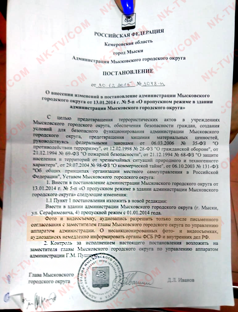 Оказывается, в 2015 году глава города Мыски Дмитрий Иванов подписал вот такой любопытный документ. К слову, когда это постановление показывают для обоснования отказа в видеосъемке, то достают его из стола, быстро показывают пункт 1.1 и также быстро убирают обратно в стол.