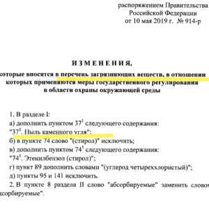 Распоряжением правительства РФ от 10 мая 2019г. №914-р внесены изменения в Перечень загрязняющих веществ, в отношении которых применяются меры государственного регулирования в области охраны окружающей среды. Этот перечень является дополнением к закону «Об охране окружающей среды». Загрязняющие вещества, в отношении которых применяются меры государственного регулирования в области охраны окружающей среды, определяются с учетом уровня токсичности, канцерогенных и (или) мутагенных свойств химических и иных веществ, в том числе имеющих тенденцию к накоплению в окружающей среде, а также их способности к преобразованию в окружающей среде в соединения, обладающие большей токсичностью. А так же с учетом данных государственного экологического мониторинга и социально-гигиенического мониторинга и при наличии методик (методов) измерения загрязняющих веществ. Теперь данный перечень дополнен наименованием «пыль каменного угля».
