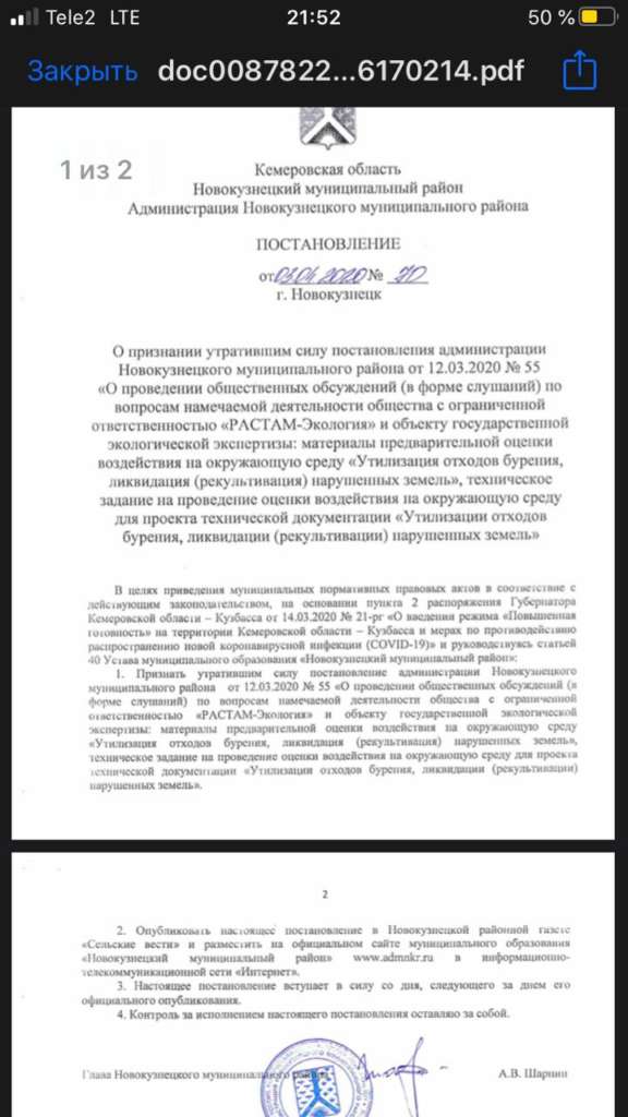 В настоящий момент постановлением администрации Новокузнецкого муниципального района от 03.04.2020 в связи с введением режима «Повышенная готовность» обсуждения отменены». Если сравнить версию, озвученную Андреем Пановым, заместителем губернатора по промышленности, транспорту и экологии, и версию чиновников Новокузнецкого района, то прослеживается странное несоответствие. Панов заявил, что в случае подтверждения эффективности этой технологии и получения всех необходимых разрешений, её можно использовать и у нас, например, для очистки почв, загрязненных при аварийном розливе нефтепродуктов. В выданном пресс-службой Новокузнецкого района варианте говорится о том, что ООО «РАСТАМ-Экология» проводит оценку воздействия технологии утилизации по разным регионам Российской Федерации презентуя свои технологии. Разве для презентации необходимы общественные слушания? Как правило, презентация проходит сначала для узкого круга заинтересованных в реализации технологии специалистов, проводятся определенные переговоры и только потом тема выносится на общественное обсуждение.