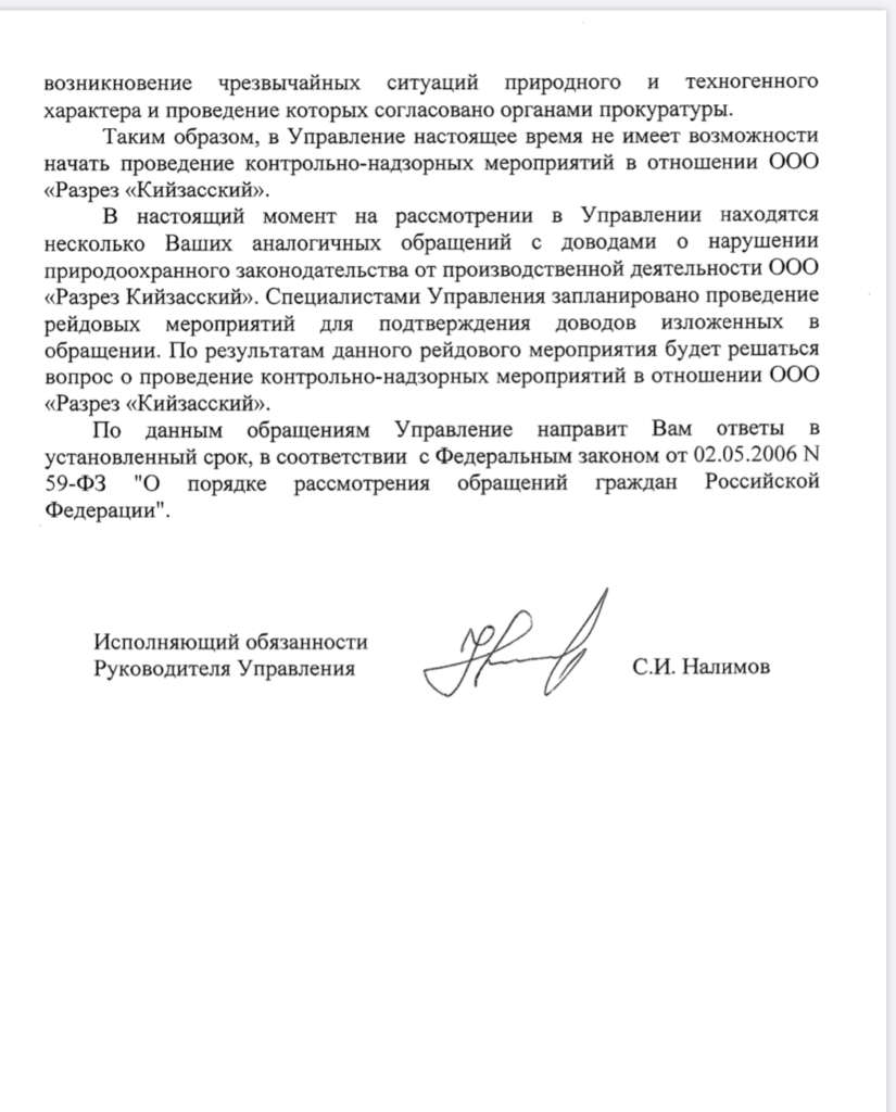 Об этом в своем ответе на запрос мысковских активистов выступающих против угольного беспредела сообщил и.о.руководителя управления Росприроднадзора С.И.Налимов. Со ссылкой на «антикоронавирусное» постановление Правительства РФ от 03.04.2020 № 438 чиновник отказал в начале проведения контрольно-надзорных мероприятий в отношении угольного разреза. Правда, Налимов обещает проведение рейдов для подтверждения приводимых общественников доводов. Но предыдущие рейды нарушения природоохранного законодательства, согласно все этого же письма, не выявлено. Похоже, черные речки в протекающие меж угольных берегов для Кузбасса не нарушение, а естественные природные пейзажи, иначе почему из года в год общественники бьют во все колокола, рассылая фотографии, называя факты, а надзорные органы отвечают, что нарушений природоохранного законодательства не выявлено.