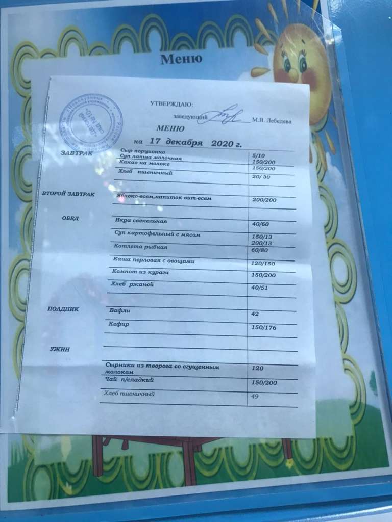 Представители родительского комитета начали свое расследование с МБУ «Комбинат питания», где им выдали замечательное специально для дошколят разработанное цикличное меню, прочитав которое нельзя не воскликнуть: «Шоб я так ел!» Все четко, разнообразно, сбалансировано. Меню имеет экспертное заключение от филиала ФБУЗ «Центр гигиены и эпидемиологии в Кемеровской области» о соответствии и рекомендовано к использованию при организации питания в дошкольных образовательных учреждениях.