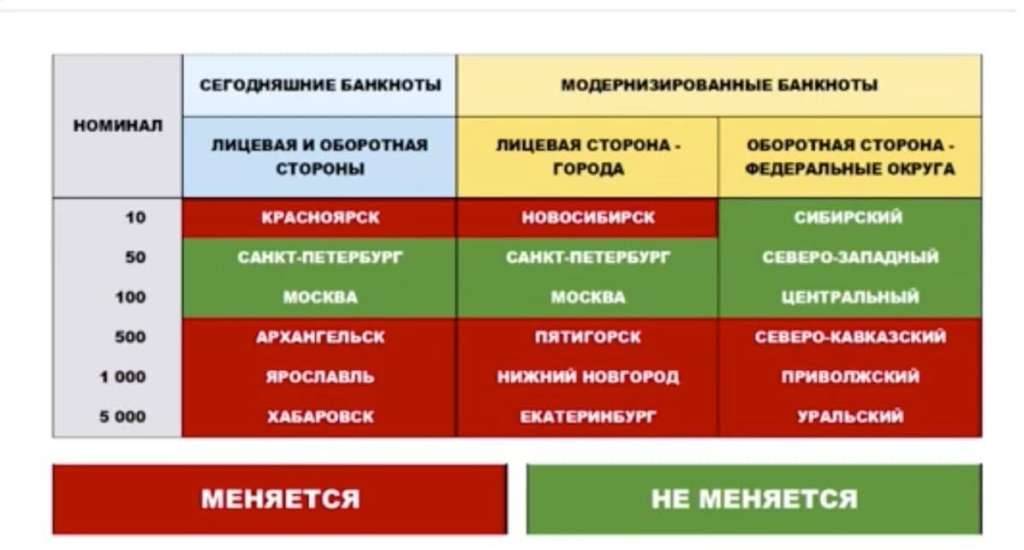 Плановая модернизация бумажных купюр будет включать совершенствование защитного комплекса и обновление дизайна банкнот номиналом 10, 50, 100, 500, 1000 и 5000 рублей. Теперь в оформлении модернизированных банкнот Банка России будет использоваться тематика федеральных округов Российской Федерации, что даст возможность показать особенности территорий, их историю и современные достижения (см.цветную таблицу). Выпуск новых банкнот планируется начать с 2022 года. Важно отметить, что существующие купюры образца 1997 года, включая все их последующие модификации, остаются законным средством наличного платежа на территории Российской Федерации и обязательны к приему по нарицательной стоимости во все виды платежей без всяких ограничений.