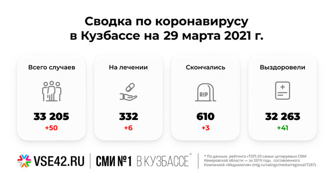 По данным оперштаба на утро понедельника, 29 марта, в Кузбассе суточный прирост больных COVID-19 составил 50. Общее число случаев достигло 33 205.