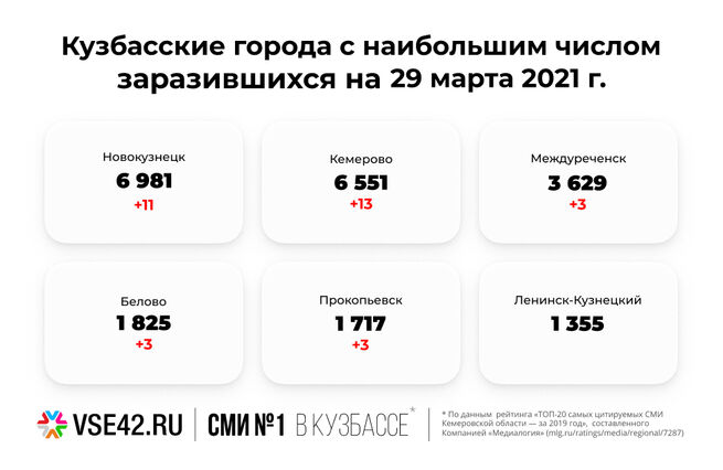 Прирост числа больных по территориям следующий: Кемерово – 13, Новокузнецк – 11, Киселевск – 5, Гурьевский МР – 4, по 3 – Белово, Березовский, Междуреченск, Прокопьевск, по 1 – Анжеро-Судженск, Беловский МР, Кемеровский МО, Прокопьевский МО, Тисульский МР.