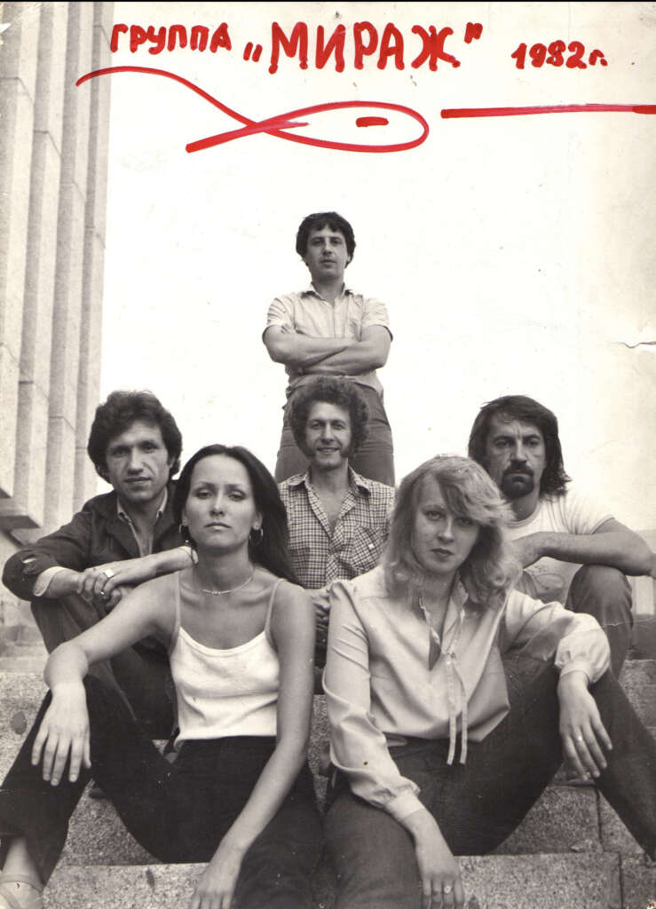 На фото группа «Мираж»: Станислав Тишкевич, Марина Царегородцева, Владимир Назаров, Михаил Сухачевский(стоит), Ирина Четвергова, Олег Рожихин, Кемеровская филармония, 1981 г. (фото из личного архива Владимира Назарова)