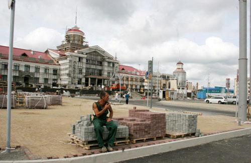 А вот там, где работают железнодорожники, дел еще невпроворот. На фасаде главного вокзала Новокузнецка все еще идут штукатурные работы — десятки рабочих быстро-быстро затирают поверхность здания на разных уровнях деревянных лесов. Красить начали только правую “боковинку” (если стоять к вокзалу лицом). Непосредственно перед вокзалом вовсю укладывают плитку. Кстати, входной узел получился выше самой площади метра на два — спускаться и подниматься люди будут по ступенькам. А по периметру верхней площадки уже поставили бетонные столбики: обещают чугунную литую ограду.