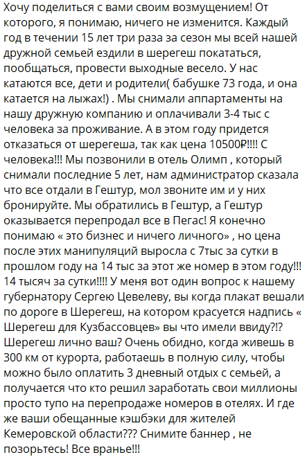Кузбассовцы поделились в соцсетях историей, где рассказали о резком подорожании цен на отели. Противнее всего жителям региона от баннера «Шерегеш для Кузбассовцев», который висит на дороге в Шерегеш.