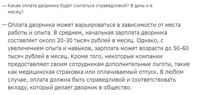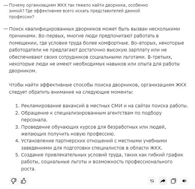 Искусственный интеллект предлагает работодателям, которые не могут закрыть вакансию дворника, давать больше рекламы в СМИ, обращаться в специализированные агентства по подбору персонала, проводить обучающие курсы для персонала. Возможно, претендентов на вакансию было бы больше, если бы заработная плата дворника, как советует ИИ, начиналась с 20-30 тысяч рублей, а с увеличением опыта и навыков возрастала до 50-60 тысяч рублей. Но, учитывая, что у жилищных организаций для увеличения заработной платы персоналу лишь один источник – квартплата, достойное денежное вознаграждение за труд дворников, равно, как и сантехников, электриков, сварщиков остаётся лишь в мечтах. В советское время дворниками шли работать за служебное жильё, но с переходом на рельсы рыночной экономики такая мера поддержки работников ЖКХ канула в небытие. Зато требований у собственников помещений в МКД стало больше. Увы, не редкость, когда жильцы бросают мусор на свежеподметённую территорию или не обращают внимания на пыль в подъезде, образующуюся во время ремонта своей квартиры, заявляя что «мы за это плОтим».