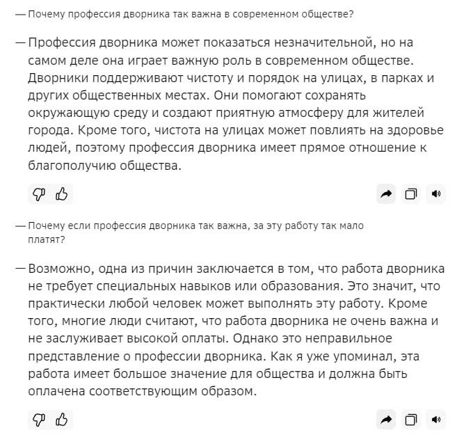 ИИ понимает важность профессии «дворник»: «Дворники помогают сохранять окружающую среду и создают приятную атмосферу для жителей города. Кроме того, чистота на улицах может повлиять на здоровье людей, поэтому профессия дворника имеет прямое отношение к благополучию человека». В управляющих организациях Новокузнецка дворник зачастую одновременно выполняет функции уборщика подъездов. К сожалению, в обществе дворницкий труд недооценивается. Например, во время ковидного карантина дворникам не предусматривалось никаких дополнительных выплат, а ведь именно на них государством была возложена обязанность обработки мест общего пользования; дворники, а не эпидемиологи в спецкостюмах чистили мусорокамеры в домах с мусоропроводами. А ведь там, в том числе, оказывались отходы, включая одноразовые носовые платки и маски людей проходящих лечение от ковида в домашних условиях.