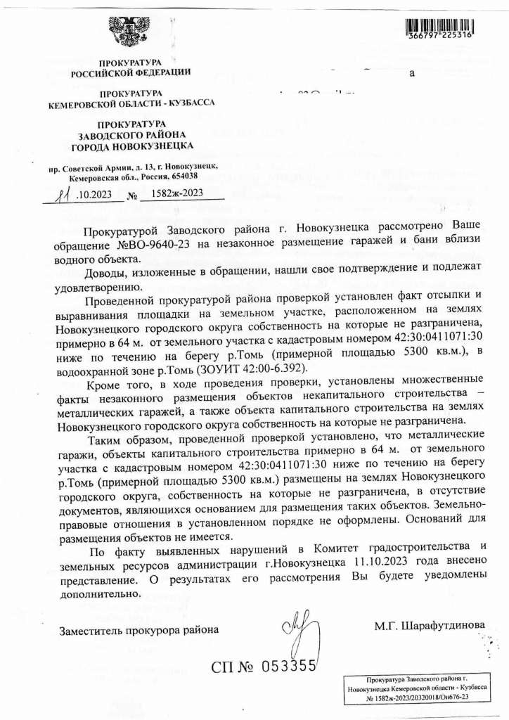 В материалах прокурорской проверки значится, что работы произведены на землях Новокузнецкого городского округа, собственность на которые не разграничена, примерно в 64 м. от земельного участка с кадастровым номером 42:30:0411071:30 ниже по течению р.Томь (ЗОУИТ (зона с особыми условиями использования территорий) 42:00-6.392). Кроме того, установлены множественные факты незаконного размещения металлических гаражей (объектов некапитального строительства), без оформления надлежащих земельно-правовых отношений.