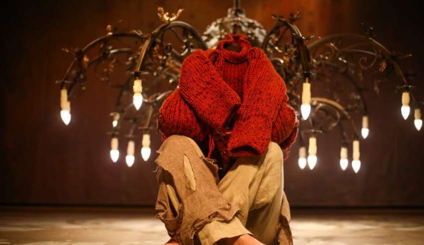 Центральную часть сцены занимает комната главного героя – вернее, её потолок, по которому он ползает (пластика – Даниил Нагайцев). Снизу торчит люстра, напоминающая раскинувшего щупальца огромного паука. Комнату Грегора окружают три стены, функционирующие как экраны и одновременно как кривые зеркала (сценография, свет – Артём Гайнанов). Они фиксируют процесс превращения бедолаги-комивояжёра в жуткого монстра с фантастическими фасеточными глазами.