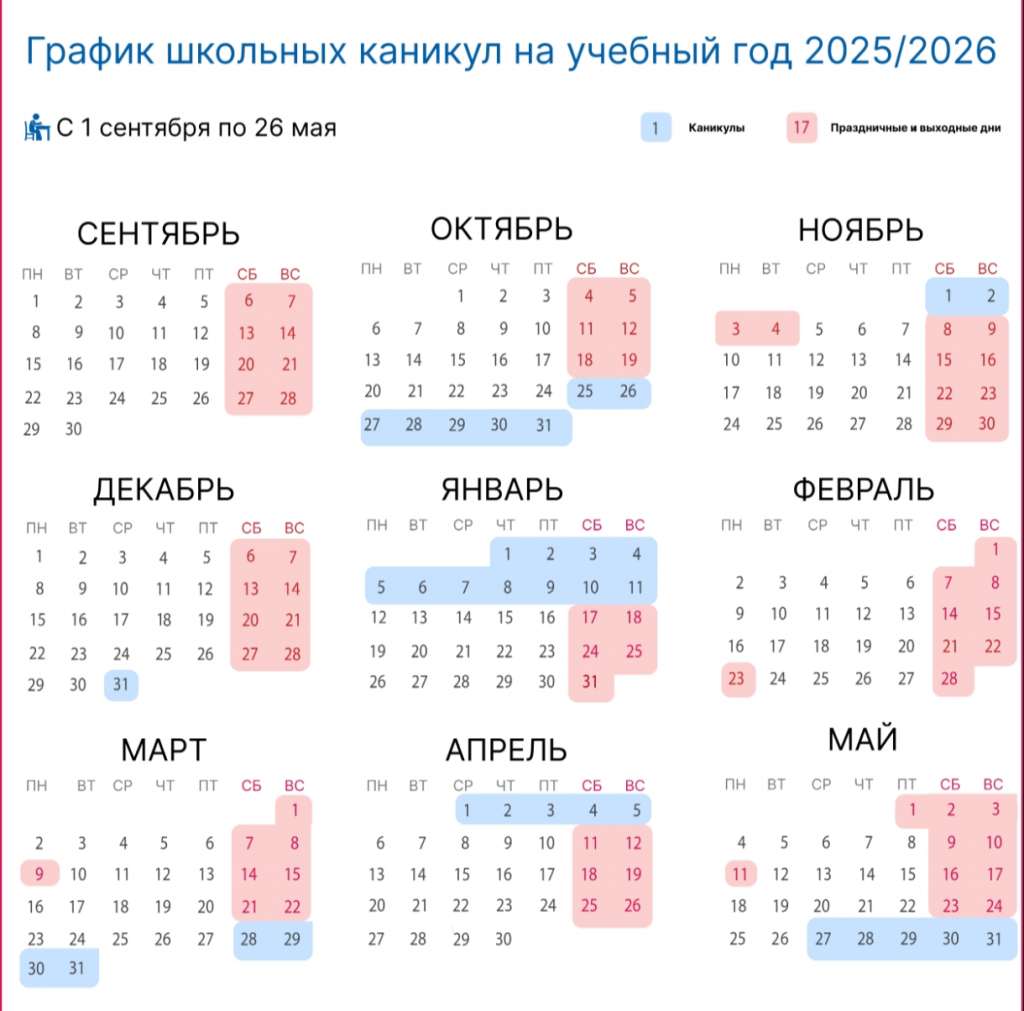 Что касается непосредственно учебного года, то школьники будут учиться с 1 сентября по 26 мая. Минпросвещения подготовлены рекомендации продолжительности школьные каникулы: они должны быть не менее 7 дней. Осенние каникулы с учетом праздничных дней 3 и 4 ноября продлятся с 25 октября по 2 ноября 2025 года; зимние - с 31 декабря 2025 года по 11 января 2026 года; весенние - с 28 марта по 5 апреля 2026 года. Летние каникулы начнутся чуть раньше, чем обычно - с 27 мая по 31 августа 2026 года.