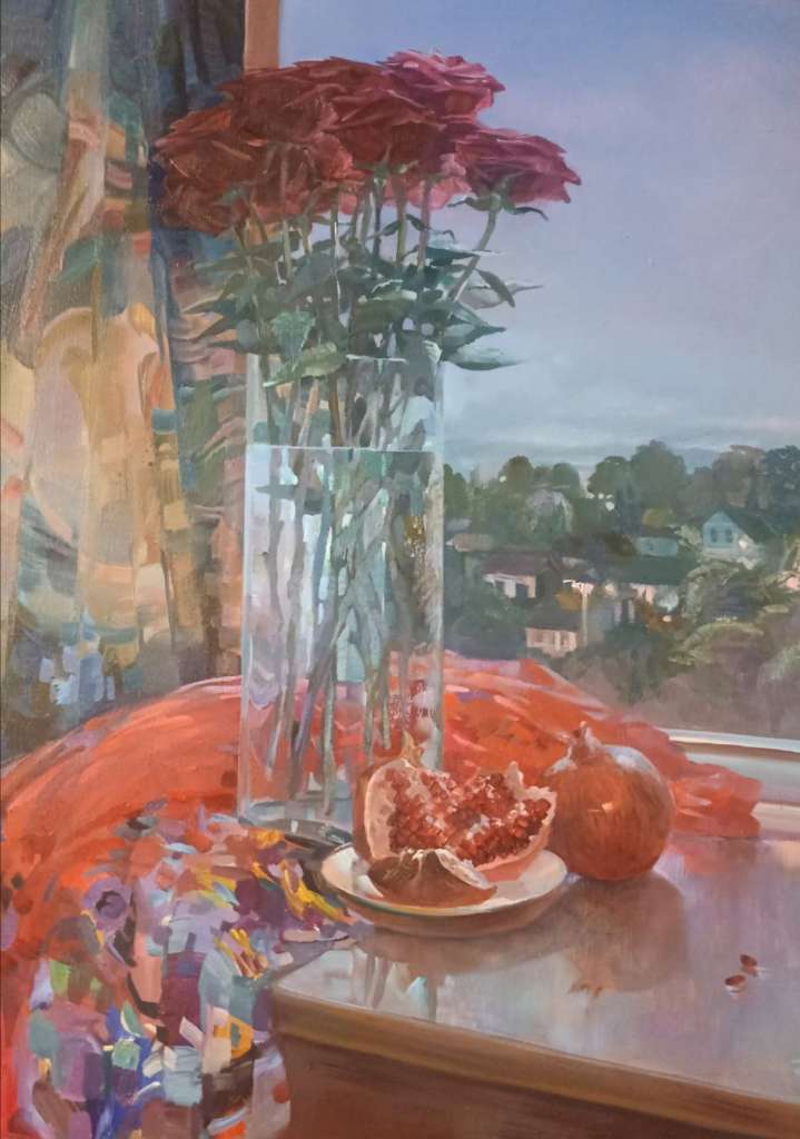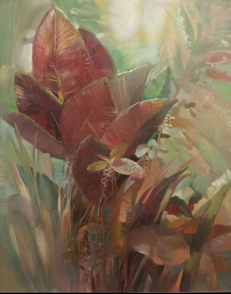 На очаровательной выставке «Цветение», – открытой в Новокузнецком художественном музее до седьмого сентября, – непостижимо соединяются весна и лето, цветение и плодоношение, скромные дачные сады и роскошные южные. Густой пеной из тёплых бутылок выплескивает цвет майская груша, а по соседству оранжево сияют августовские апельсины. Плывут розовые облака флоксов и синие – стыдливой пролески. Взрываются ядерные бомбы бордовых гранатов, яблок, роз.