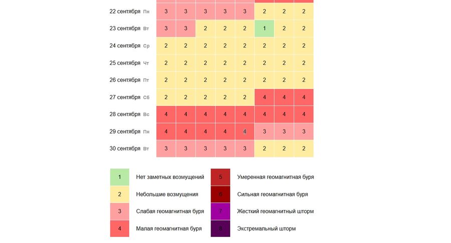 Отмечается, что интенсивность возмущений магнитного поля будет находиться в пределах «малых» значений. Однако уже вечером в понедельник, 29 сентября, они станут «слабыми», а затем и «небольшими».