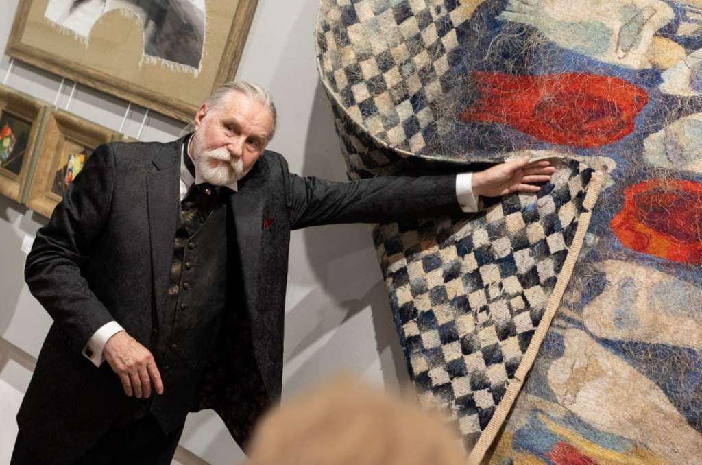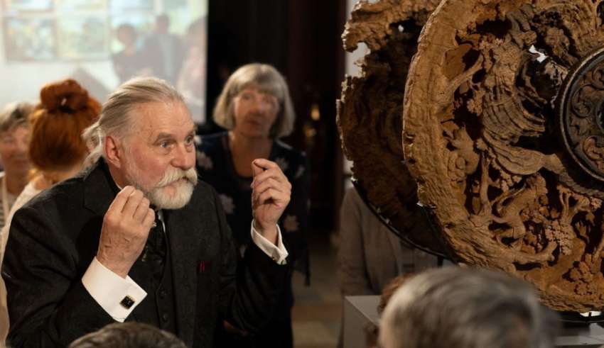 Разменявший восьмой десяток, но чрезвычайно энергичный и артистичный, он сам проводит экскурсии по привезённым выставкам. То ласковой голубкой вьётся, то коршуном разит. Его так много – просто человек-оркестр.