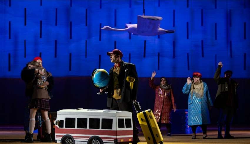 Такая режиссёрская точка зрения – откуда-то извне и сверху, так что охватывает всё в объёме, – мастерски подчёркивается декорациями. Они – пятиэтажки Колиного посёлка-городка и приезжающий за Колей очаровательно-игрушечный автобус – едва ли достают персонажам до колена. Художник спектакля Надя Скоморохова создала удивительную сценографическую метафору: по сравнению с Колей, его друзьями, соседями и возлюбленной даже сама Земля – в виде глобуса, который он держит под мышкой, – кажется невероятно маленькой и беззащитной.