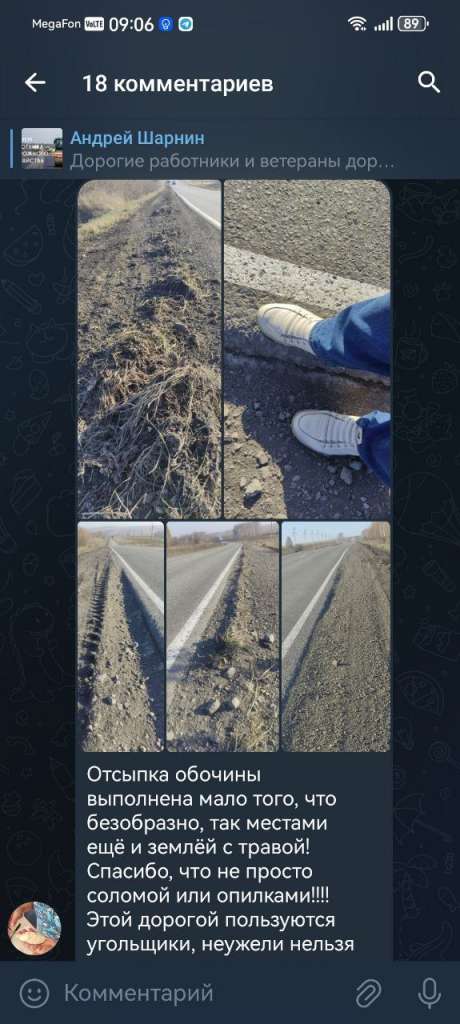 Об этом кузбассовцы рассказали и в подтверждение своих слов опубликовали фото на странице главы Новокузнецкого муниципального округа. «За такую досыпку и досыпщикам и их руководителю хорошего пендаря дать и это ещё мягко сказано. Или за свой счёт переделать свой брак»; «Отсыпка обочины выполнена мало того, что безобразно, так местами ещё и землёй с травой! Спасибо, что не просто соломой или опилками!!!! Этой дорогой пользуются угольщики, неужели нельзя их заставить отсыпать обочины? Либо в целях безопасности запретить проезд углевозов, потому что легковушки на этом участке дороги разъезжаются, а вот соседство с большегрузами вынуждает прижиматься к обочинам», — написано в комментариях.