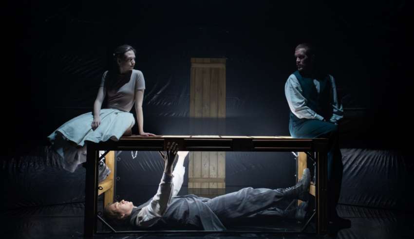 Пластика персонажей в прямом смысле завораживает. Они то кружатся в диковинном танце, эффектно изображающем убиение главным героем старухи-процентщицы. То один из них – Раскольников – буквально зависает в странной тесной конструкции. К слову, она отлично рифмуется с похожей на гроб длинной узкой съёмной квартирой, созданной пером Фёдора Михайловича. А главное – она является зримой метафорой бредящего и страдающего разума убийцы, которого разрывают на части муки совести и зарождающаяся любовь.
