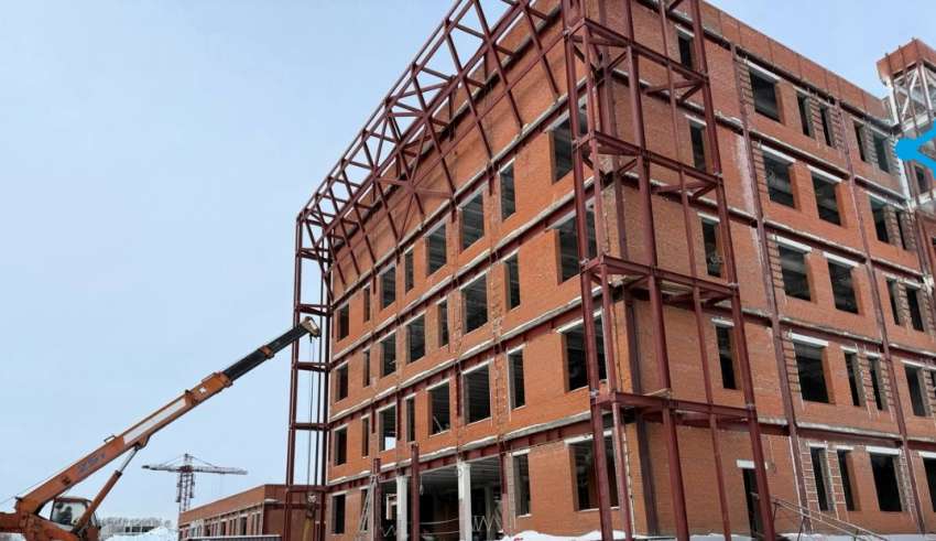 На данный момент здание готово на 43%. Сейчас уже установлен несущий каркас здания, металлические конструкции сделаны на 97%, 3% — это крыльца, которые не влияют уже на дальнейший технологический процесс производства работ. Об этом рассказал председатель совета директоров ООО «СДС-Строй» Максим Николаев.