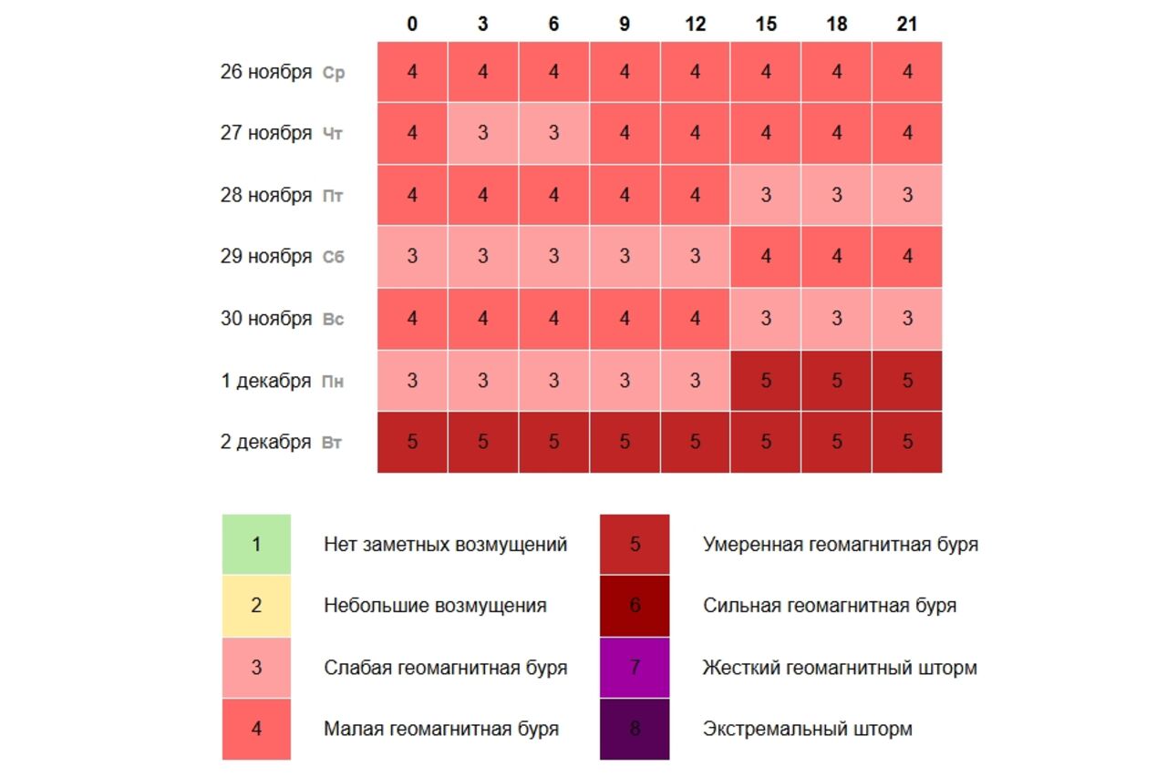 По данным сервиса Time-in, в начале декабря Кузбасс ожидает период магнитных бурь. Возмущения магнитного поля Земли начнутся вечером 1 декабря и достигнут уровня «умеренных». Такой прогноз сохраняется и на сутки 2 декабря.