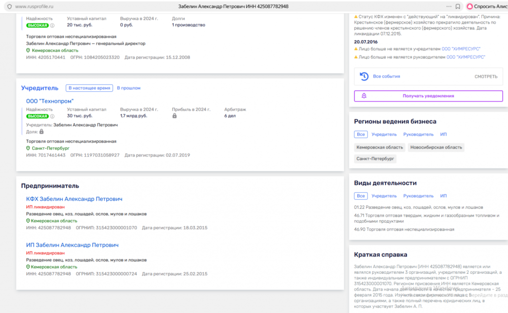 Заниматься рыбоводством будет ООО «Технопром» (ИНН 7017461443). Согласно выписке из ЕГРЮЛ данное общество с ограниченной ответственностью зарегистрировано в г. Санкт-Петербург. Директором и учредителем является Забелин Александр Петрович. Основной вид деятельности – Торговля оптовая неспециализированная. Дополнительных видов деятельности не указано. Наверное, будет форель оптом продавать, но почему тогда инвестпроект по выращиванию и переработке этого вида рыбы?