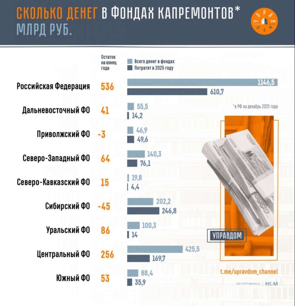 В целом по стране эксперты указывают на значительное снижение «подушки» региональных фондов капремонта. Запас средств продолжает сокращаться, а в ряде округов уже формируется кассовый разрыв. На конец года общий остаток капремонта составил 536 млрд рублей. В России в 2025 году планировалось сделать работы в 43 502 МКД. Годом ранее таких домов было 87 000. Парадокс: количество отремонтированных МКД снизилось в 2 раза и одновременно с этим уменьшается количество денег в фондах капремонтов. Как тут не вспомнить Галину Хованскую, которая говорила, что общий котел — имеет признаки финансовой пирамиды, которая когда-то рухнет.