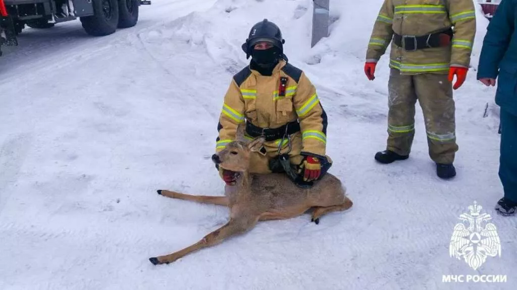 На помощь животному незамедлительно выдвинулись пожарные первого караула. Специалисты аккуратно освободили косулю и отнесли ее в пожарный автомобиль. Убедившись, что животное не травмировалось, бедолагу доставили в лесной массив и вернули в естественную среду обитания.
