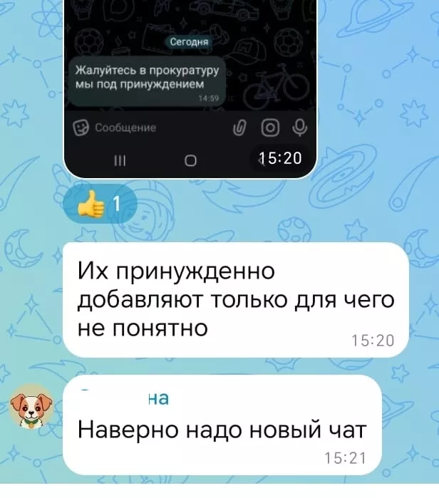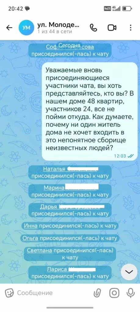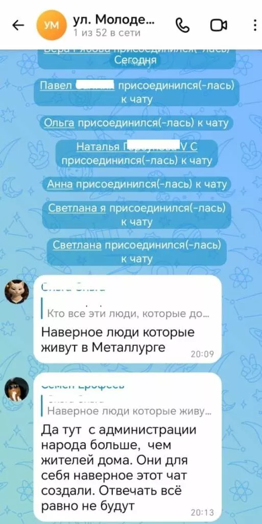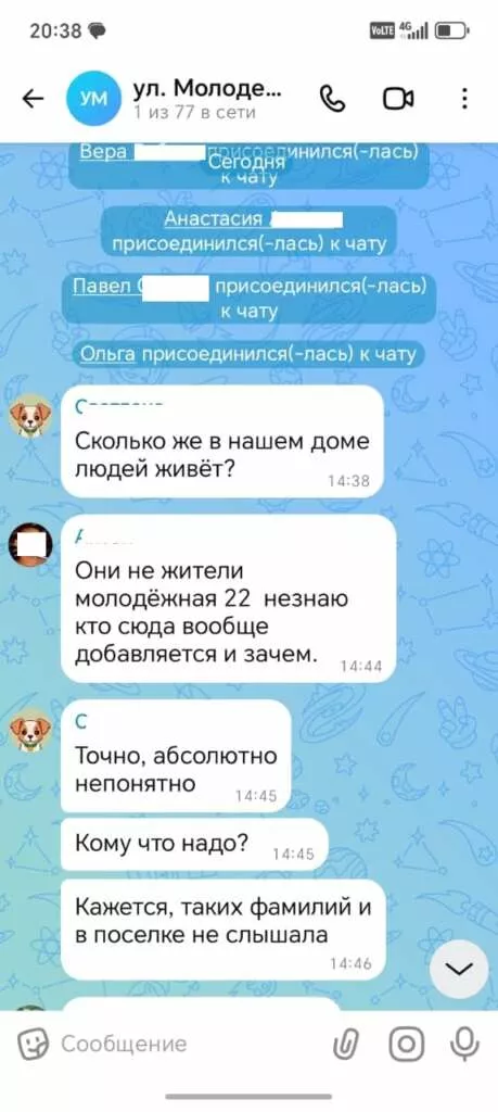 Председатель Совета дома Семен Е. рассказывает о том, что они у себя в доме завели второй чат, где идет общение между соседями без посторонних: мы не знаем, кто все эти люди, которые постоянно добавляются в чат, может быть это чёрные риэлторы, которые ищут себе «клиентов» или мошенники, которые попытаются выйти на контакт с одинокими пенсионерами. «Старшая» из соседнего дома Лариса К. смеётся: «У нас в доме 48 квартир, в чате 44 участника, из них только я и глава нашего посёлка жители, остальные неизвестно кто и зачем здесь, а общаемся мы в Телеграмм или по телефону». Их коллега по общественной работе Антон Б. спросил у одной из новых участниц, кто она и зачем в чате, ответ: «Жалуйтесь в прокуратуру мы под принуждением». Жители этого дома тоже предлагают завести отдельный чат и не допускать в него посторонних.