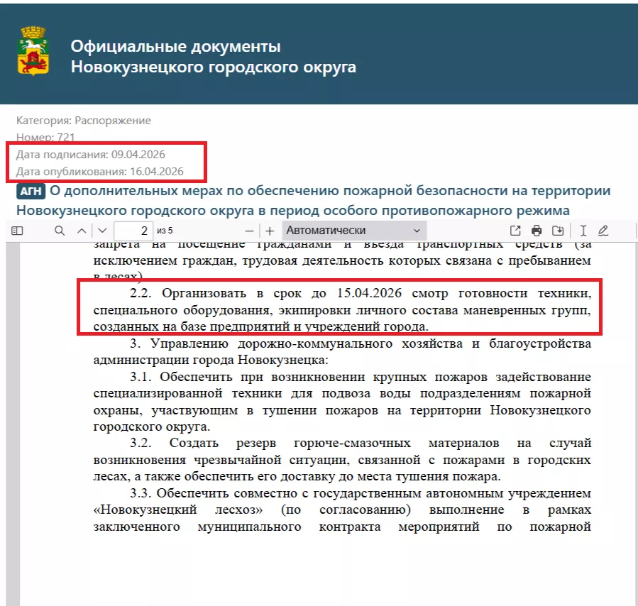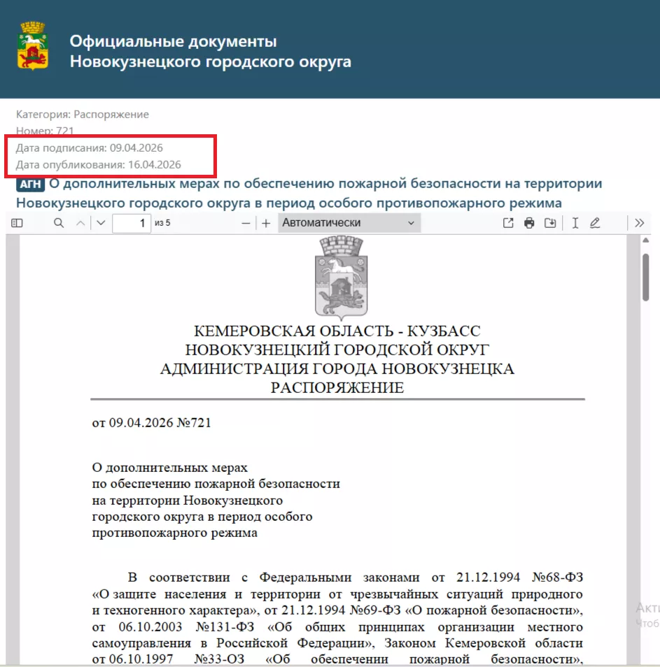 Распоряжение о принятии дополнительных мер по обеспечению пожарной безопасности на территории Новокузнецкого городского округа в период особого противопожарного режима принято и опубликовано.