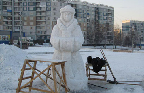 Уже готовы изваяния снегурочки и символа наступающего года — лошади. В последние дни были небольшие снегопады, и они очень выручили.
