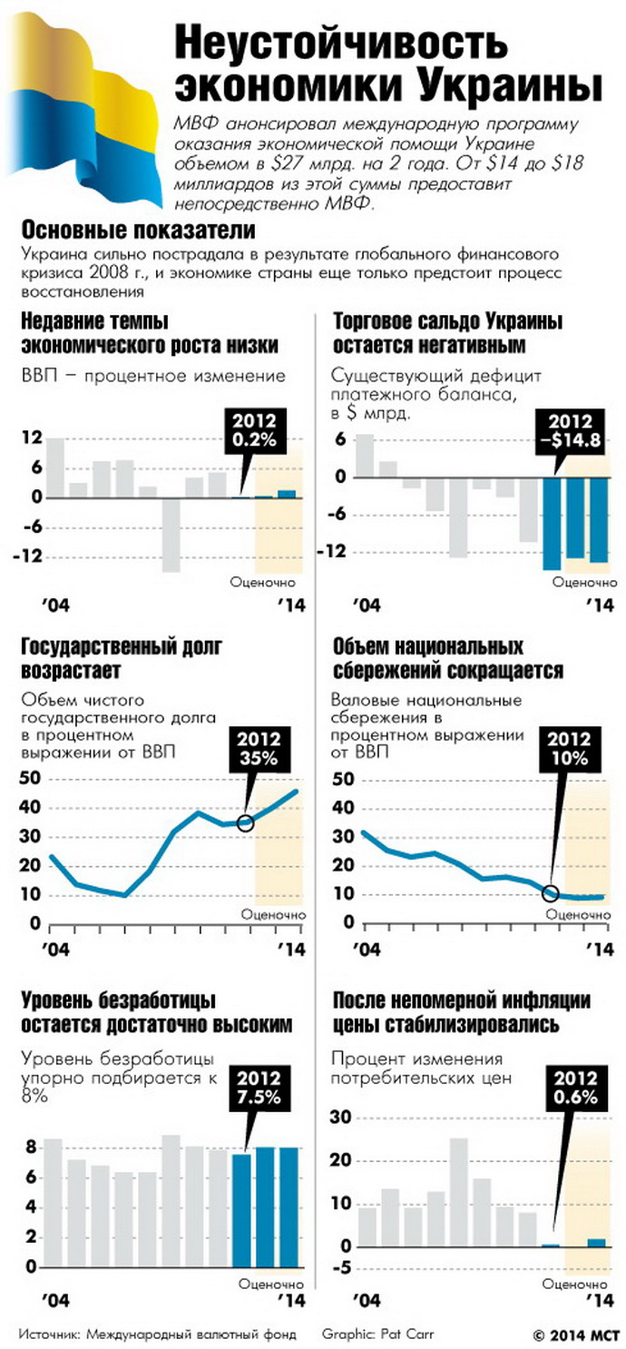 27 марта 2014 года МВФ озвучил общие тезисы положений и условий кредитования и оказания иной помощи украинской экономике. Все эти положения и условия подразумевают вовсе не спасение экономики Украины, а погружение украинского населения в экономическую депрессию по греческому сценарию.