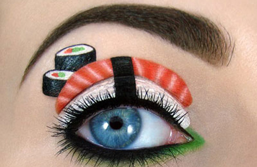 Самая популярная работа Tal Peleg – это суши. При помощи ярких минеральных красок и густой черной подводки она изображает на веках нигири суши: шарик риса, покрытый кусочком красной рыбы и перевязанный полоской нори. Дополняет картину ярко-зелёная полоса, символизирующая соус васаби. По словам визажиста, такая цветовая палитра подойдет к любому цвету глаз.