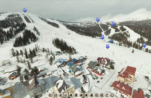 Тур включает в себя 16 трехмерных панорам, снятых с высоты с помощью специального оборудования для аэросъемки, и охватывает практически все значимые для туристов объекты – от горнолыжных трасс, подъемников и гостиниц до автодорог и поселка.