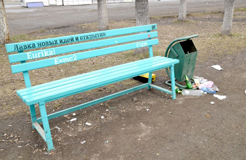 Аллейка с лавками “новых идей и открытий”, “счастливых встреч”, “романтики” и так далее, которая с недавних пор появилась на Кирова на подходе к “Спортсмену”, сначала отметилась “венецианским утоплением” в половодье, а теперь приобретает обжитой вид: утром, после “счастливых встреч”, здешние мусорницы полны, а рядом валяются не вошедшие в них пивные бутылки. Это уже по-нашему, а то — “Эврика да эврика!”