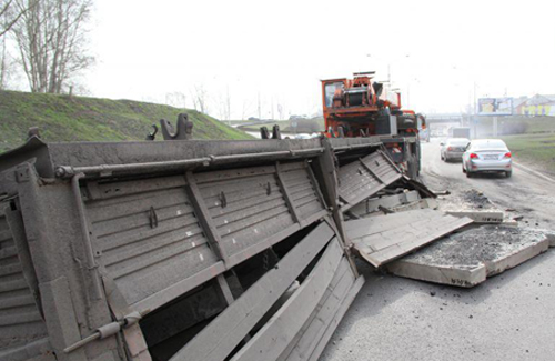 Плиты упали на землю и перегородили дорогу. В 10.00 на месте происшествия начал работу кран, который поднимает плиты и убирает их с дороги.