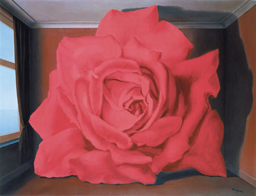 Магритт играет, пытаясь удивить и ещё больше удивляясь сам… Что получится, если маленькую красивую розу – тоже великий символ! – поместить в большую комнату, но при этом изменить пропорции и той, и другой, чтобы роза стала большой, а комната маленькой? А если обычные предметы, с помощью которых женщина привыкла ухаживать за собой, разложить на другие обычные предметы, которые есть в любой женской комнате, чтобы огромная расчёска стояла на крошечной кровати, а на маленьком шкафу лежала большущая кисточка для пудры? А если выписать стеклянный бокал так близко, будто он гораздо выше гор и внутри него застыли взбитые сливки настоящего облака? Чтобы голубь занимал почти всё небо? Чтобы наверху сиял день, а внизу царила ночь, загадочно и тревожно подсвечиваемая единственным фонарём и одиноким окном? Чтобы в городе падал дождь из крошечных мужчин, одетых в строгие костюмы и шляпы, – это, кстати, «Готонда», шедевр Рене, то ли цитирующий Кафку, то ли вспоминающий историю про древнеиндийскую крепость с одноименным названием?!
