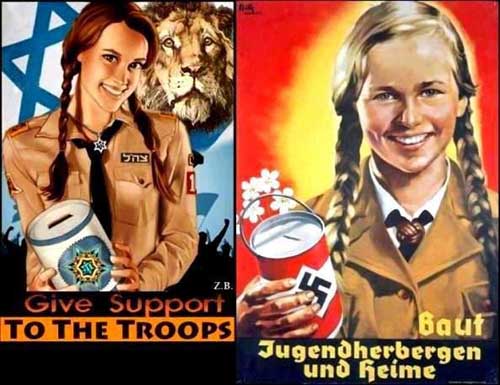 Слева, израильский баннер гласит: “поддержи войска” (те, которые служат для оккупации Палестины) а справа (немецкий баннер 30-х годов) мы видим текст: “Постройте свой дом для молодых людей».