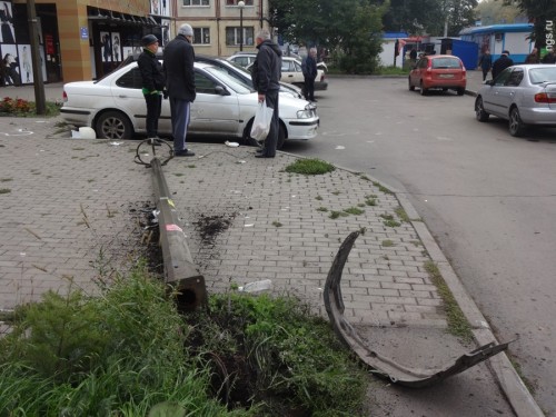 Вчера, 17 сентября, около 7 часов утра у здания по пр. Ленина, 88 в Кемерово неизвестный водитель черной иномарки снес фонарный столб и скрылся.